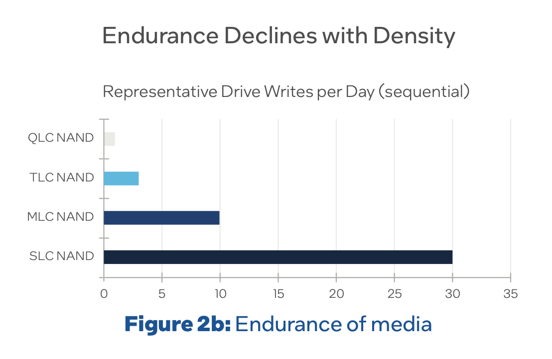 the available Program/Erase cycles decline with higher density NAND. This reduces the endurance/effective lifetime of a QLC SSD significantly as depicted in Figure 2b