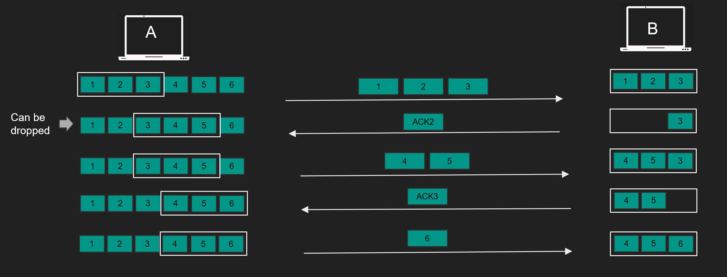 - 송신: 송신자는 일정 범위 안에서 여러 패킷을 보냅니다. 그리고 패킷이 도착했을 때마다 수신자는 해당 패킷에 대한 ACK를 보냅니다. ACK를 수신하면 윈도우가 앞으로 슬라이딩되면서 송신자가 새로운 데이터를 더 전송할 수 있게 됩니다.