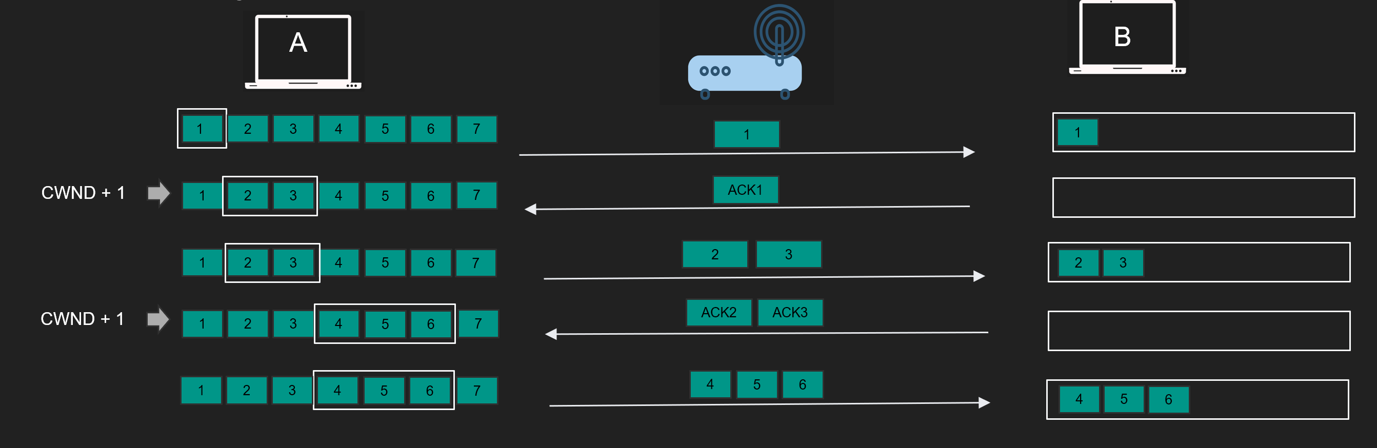 Congestion Window size 증가량을 매 ACK마다 1씩 늘려보는 방법입니다. (exponentially 증가합니다)